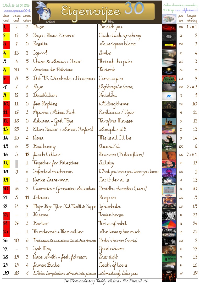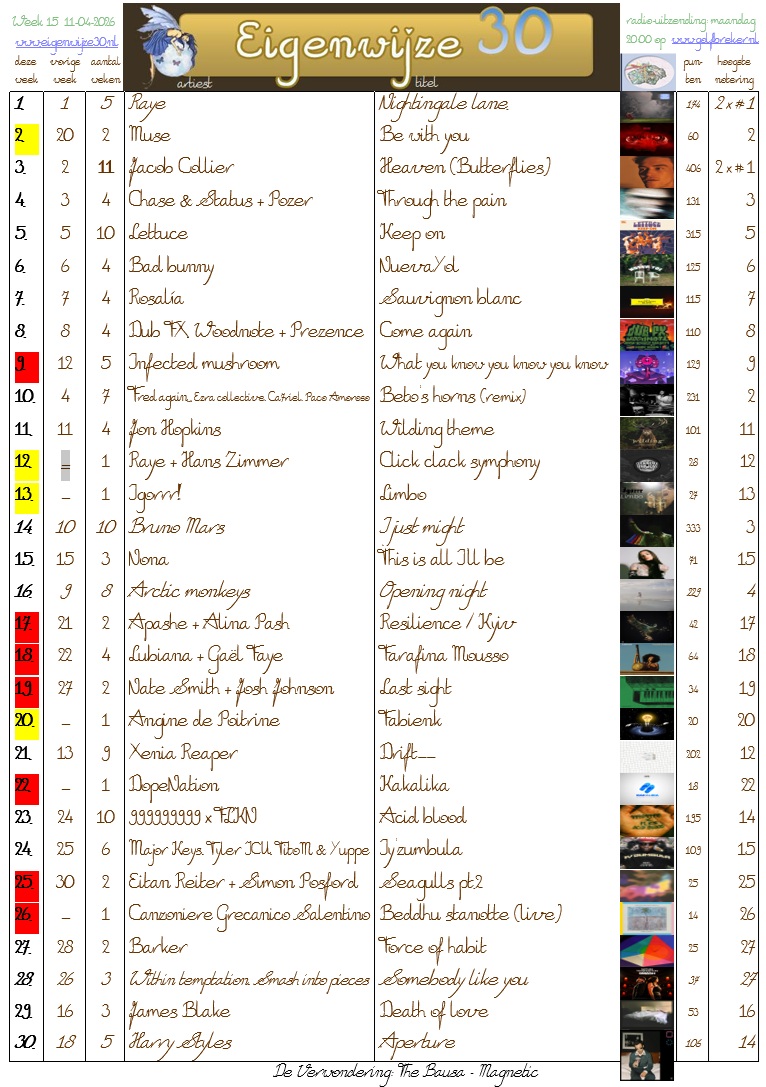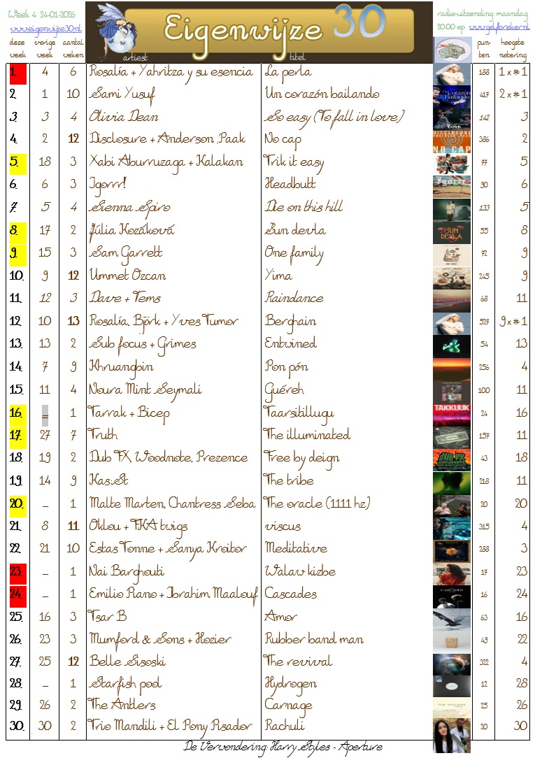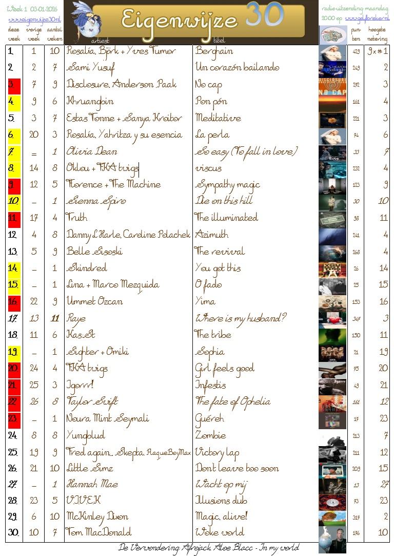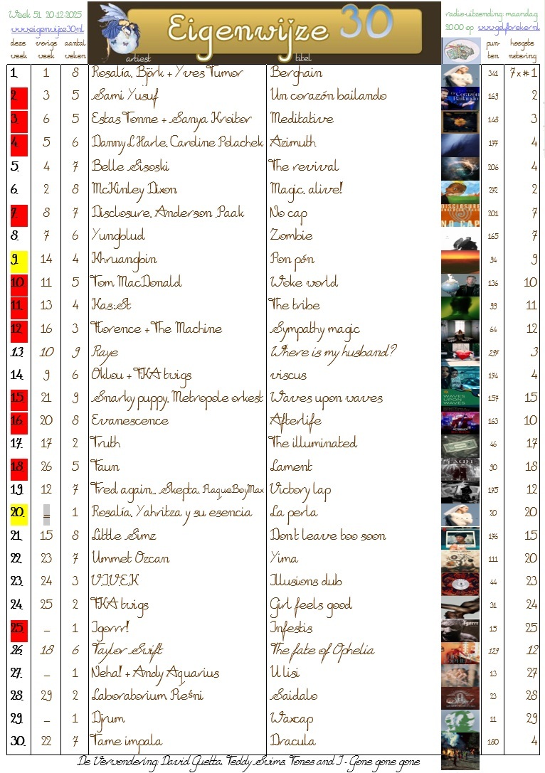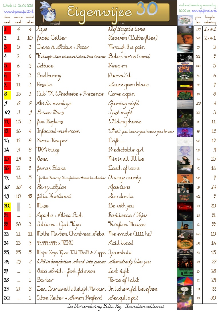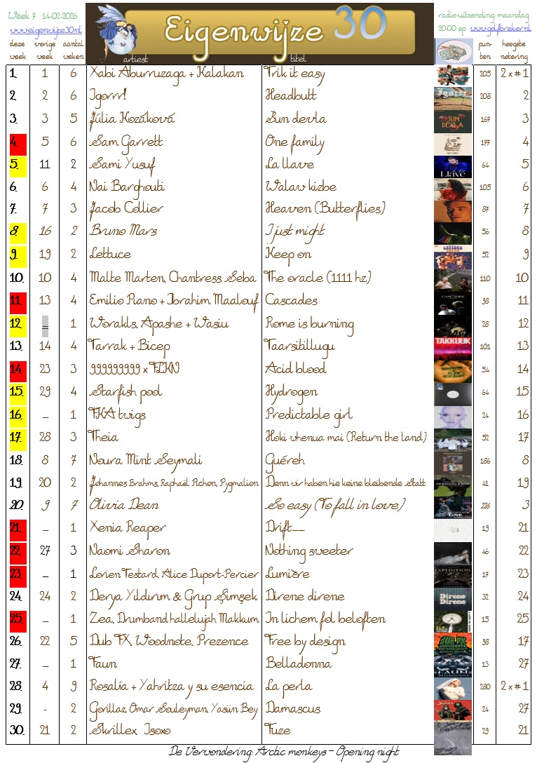 Op de onderstaande nummers kun je stemmen om ze hoger in de Eigenwijze 30 te krijgen, of te laten binnenkomen, of geef een andere tip! Stuur een e-mail met je keuzes.
